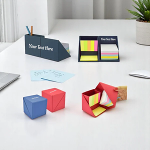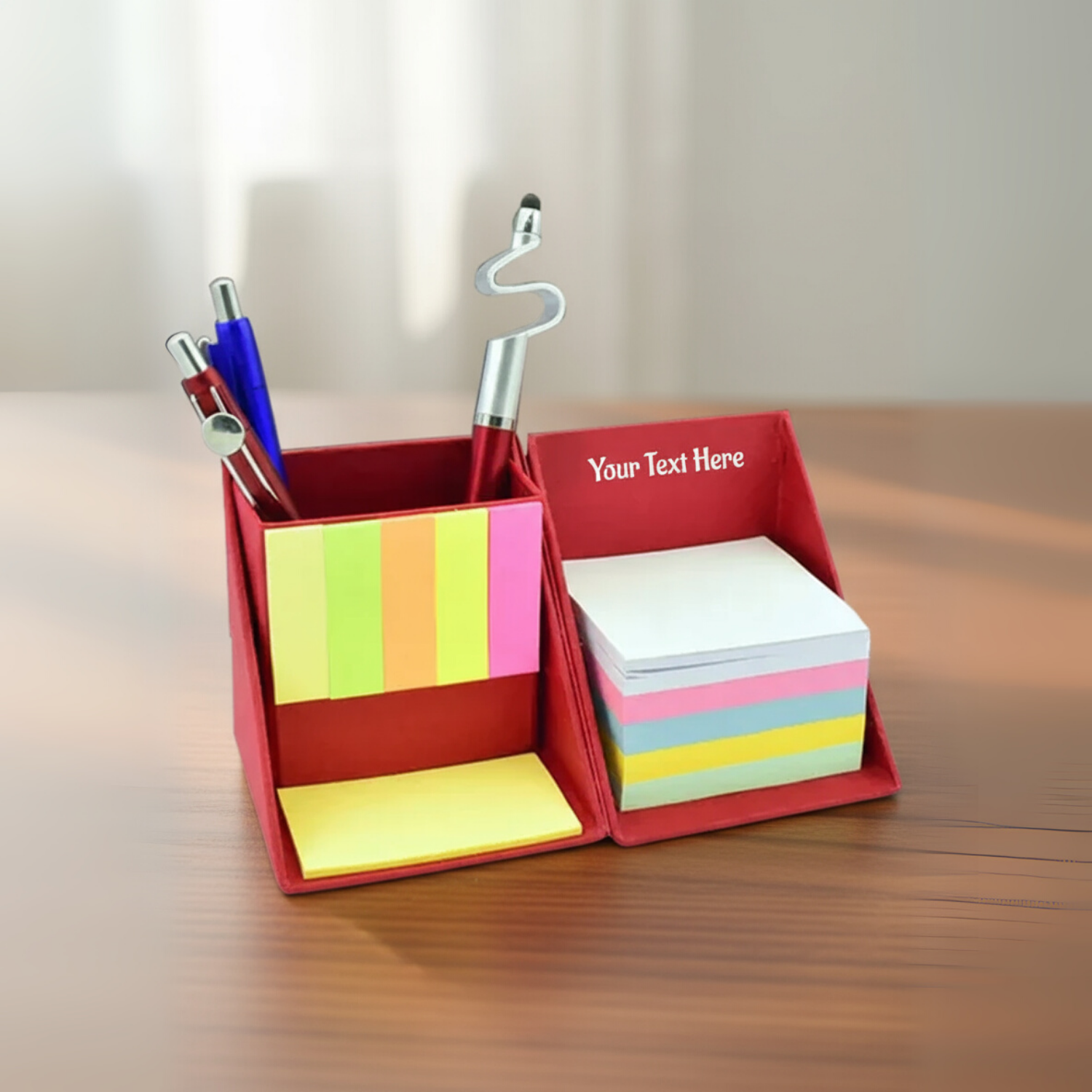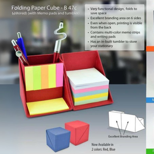 Very functional design, folds to save place with excellent branding area on 6 sides and contains multi-color memo strips, writing pads and in-built tumbler to store your stationery.