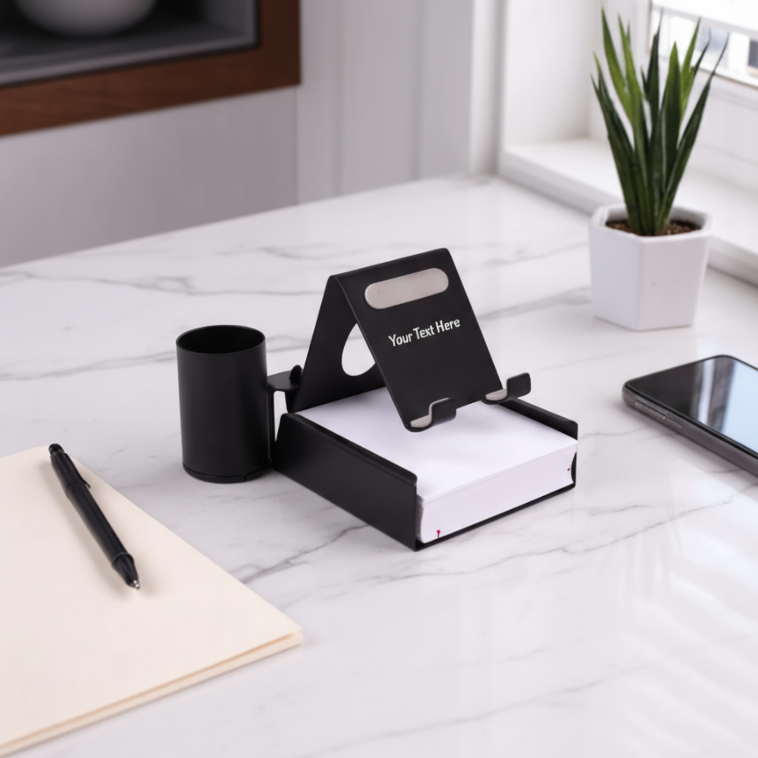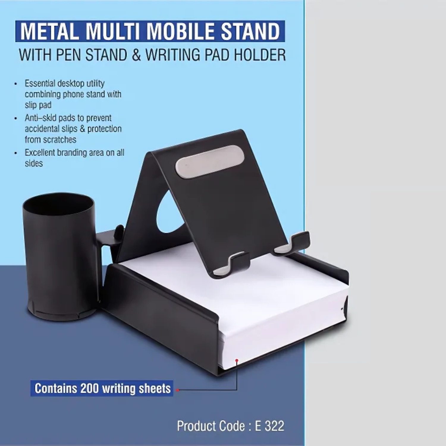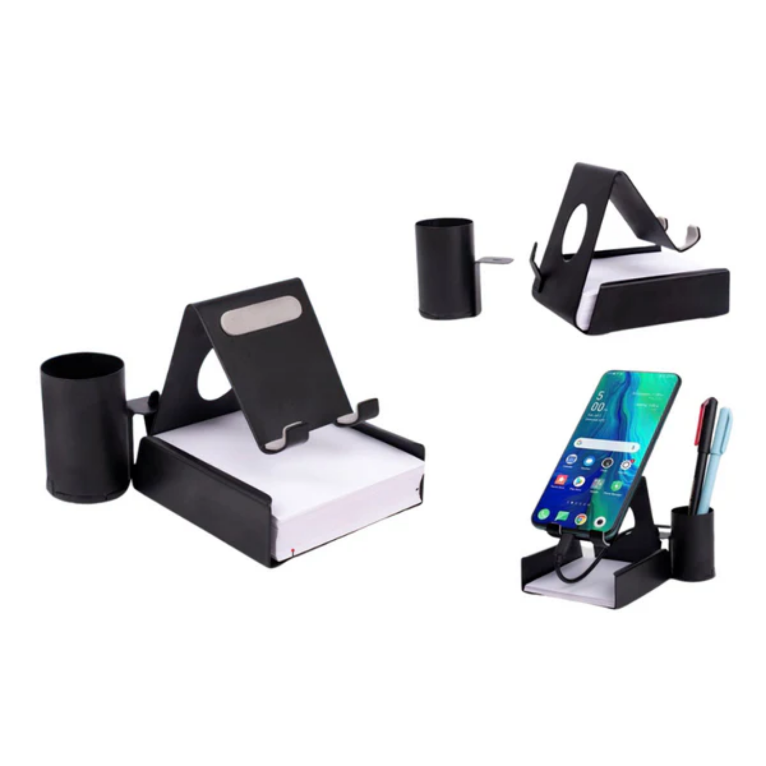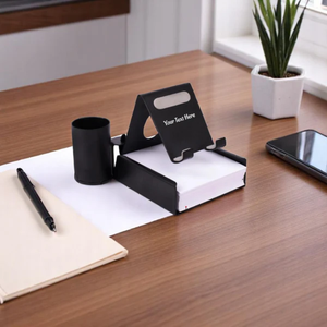 – Essential desktop utility combining phone stand with slip pad